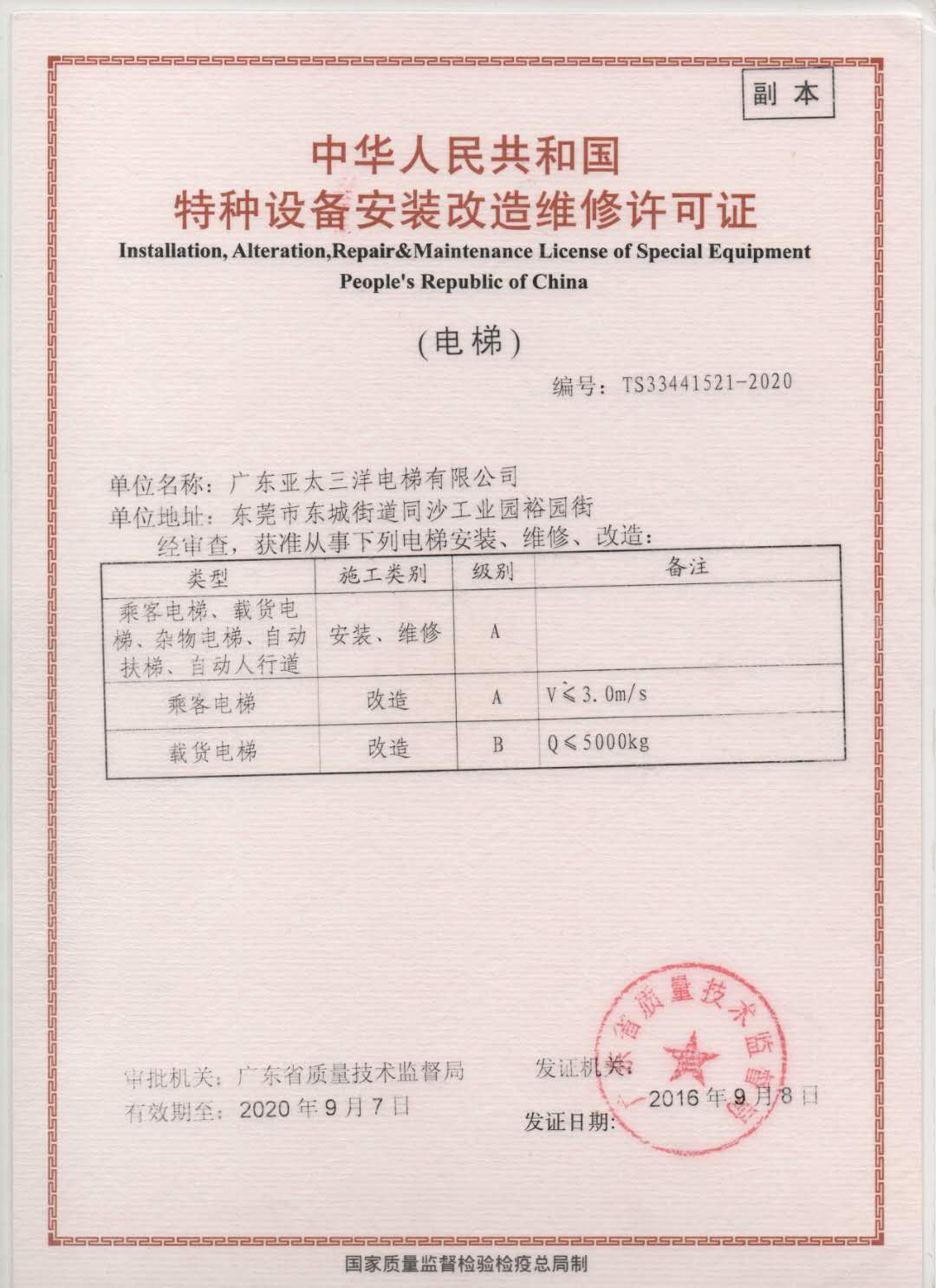 廣東亞太三洋電梯有限公司是從事電梯產(chǎn)品設(shè)計(jì)、制造、安裝及售后服務(wù)的專業(yè)公司,其前身是廣東地區(qū)較早成立的電梯企業(yè)之一,成立于1993年,是一家擁有世界先進(jìn)技術(shù)的電梯企業(yè)。先后獲得了國(guó)家質(zhì)量監(jiān)督檢驗(yàn)總局及國(guó)家有關(guān)部門(mén)頒發(fā)的(AAA)生產(chǎn)許可證和安裝資質(zhì),并通過(guò)了行業(yè)質(zhì)量體系認(rèn)證,產(chǎn)品行銷(xiāo)世界30多個(gè)國(guó)家和地區(qū)。“好品質(zhì),用心打造”,亞太三洋電梯堅(jiān)持一絲不茍地控制所有生產(chǎn)工藝,秉承質(zhì)量的精益求精和工藝的日臻完善...